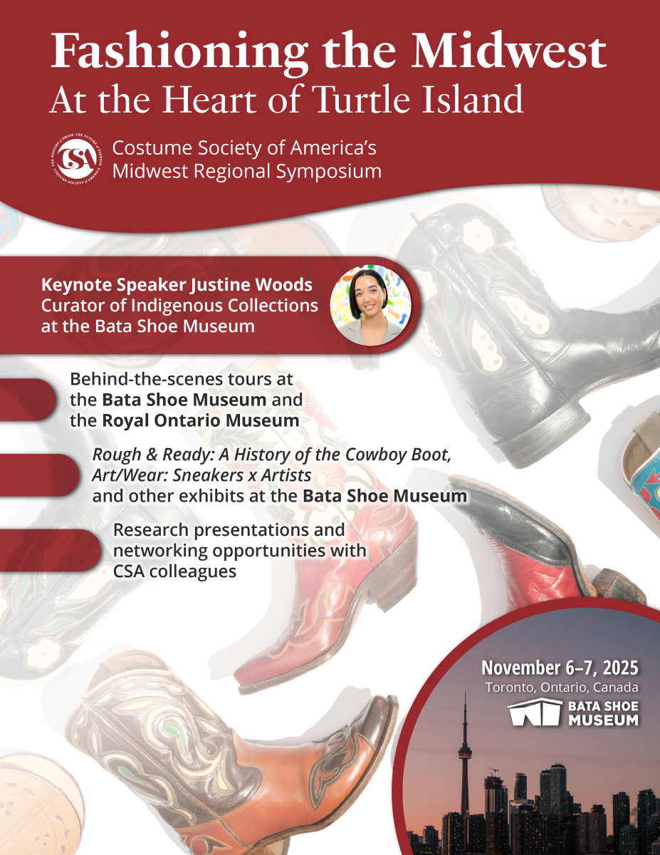 The Costume Society of America’s Midwest Region invites you to the beautiful city of Toronto, Ontario, Canada for Fashioning the Midwest, At the Heart of Turtle Island, a two-day regional symposium in Downtown, Toronto. This event will offer tours of the Bata Shoe Museum and the Royal Ontario Museum along with presentations, social and networking opportunities.